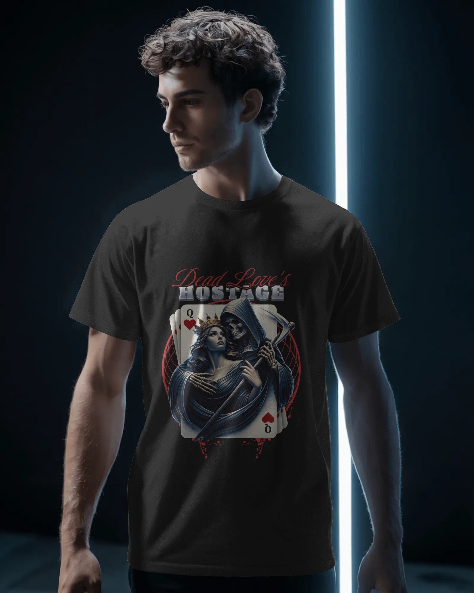 Edgy and expressive, this “Dead Love Hostage” T-shirt blends bold graphics with soft cotton comfort. Perfect for streetwear, concerts, and those who wear their emotions with style.